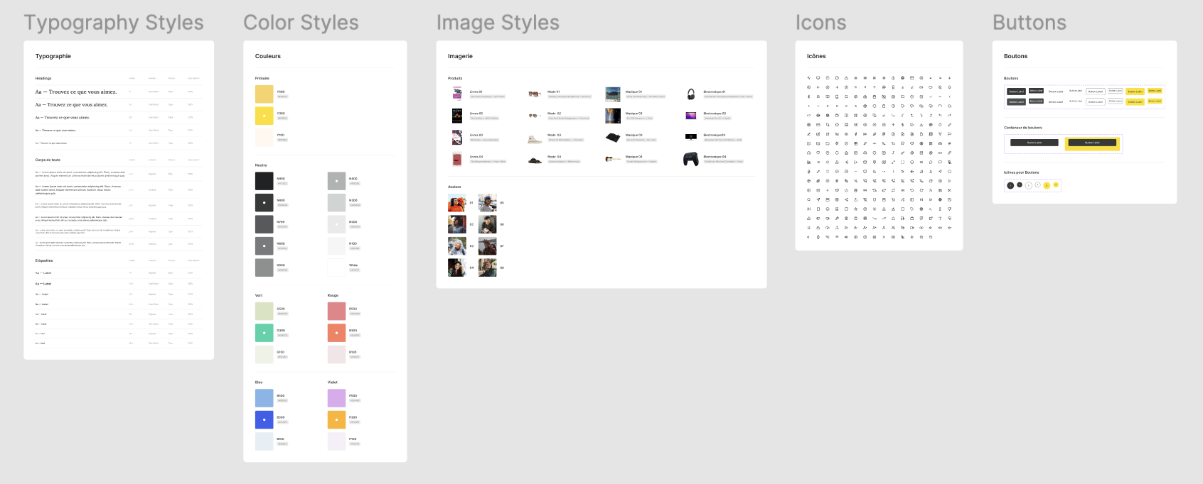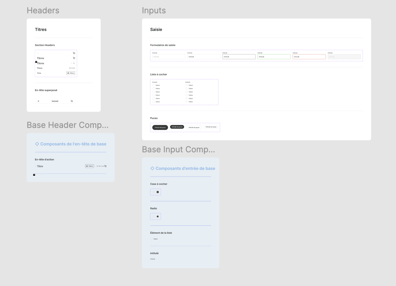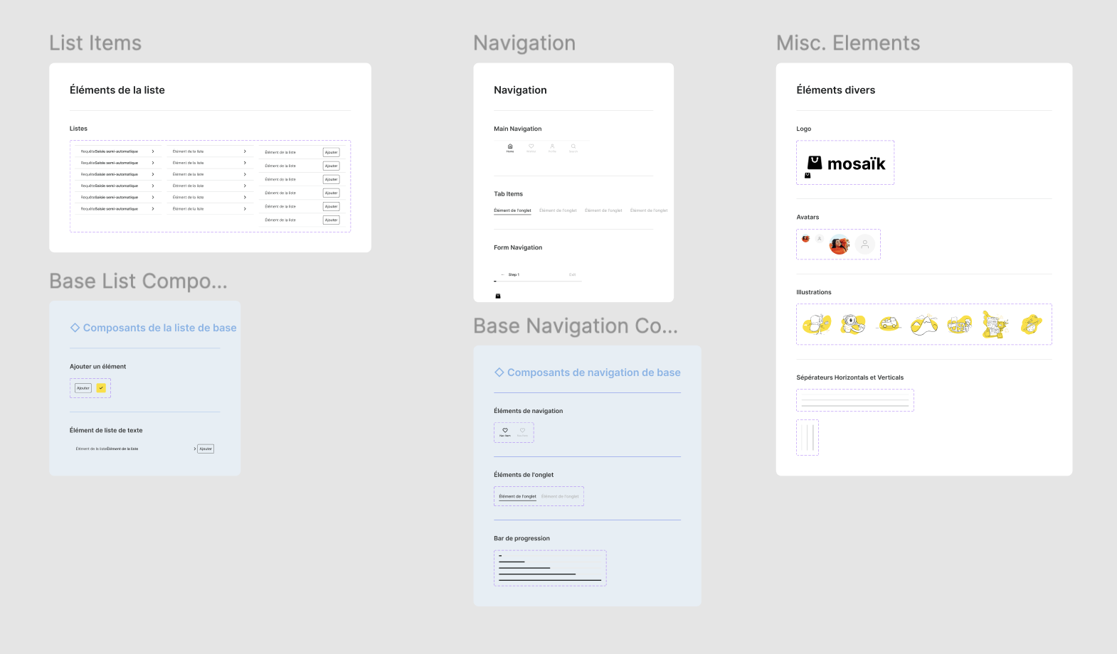 Après avoir développé mon idée, je commence à assembler les pages et à réfléchir à l’introduction ainsi qu’aux éléments clés comme l’écran d’accueil. En analysant les flux utilisateurs, je conçois les écrans d’inscription et identifie les différents scénarios. Il extrait alors les divers composants (cards, images, variantes) afin de les regrouper et de les simplifier. Cette démarche permet de clarifier le design, d’éviter une prolifération de modèles et de rendre les interfaces plus compréhensibles pour les utilisateurs. En phase de conception à moyenne‑haute fidélité, j'organise les éléments extraits (en‑têtes, navigation, boutons, conteneurs) en composants réutilisables, ce qui facilite grandement la suite du travail de conception.